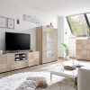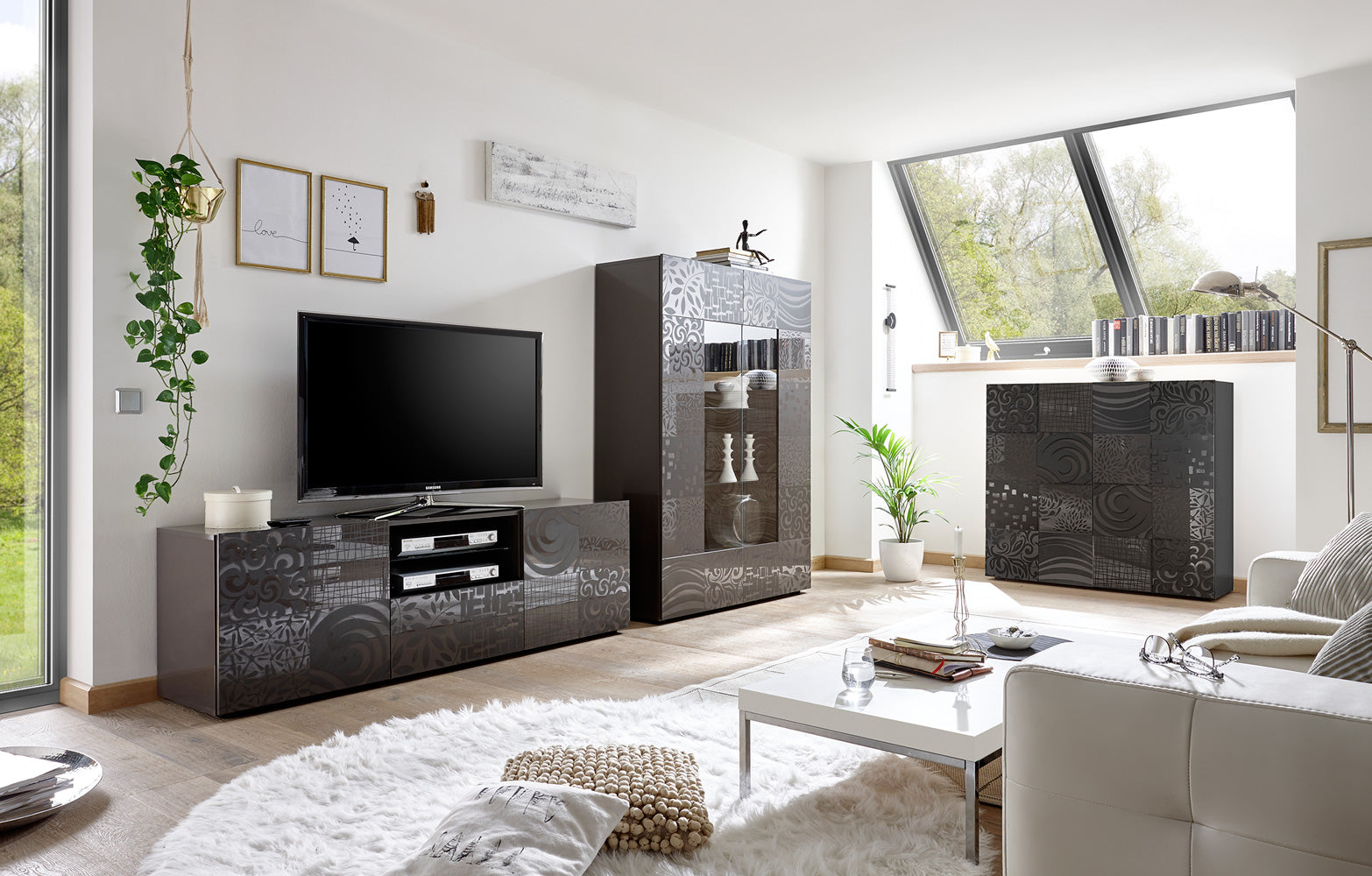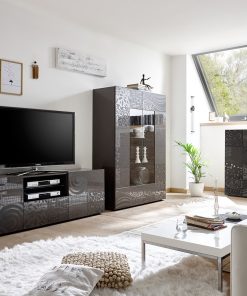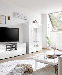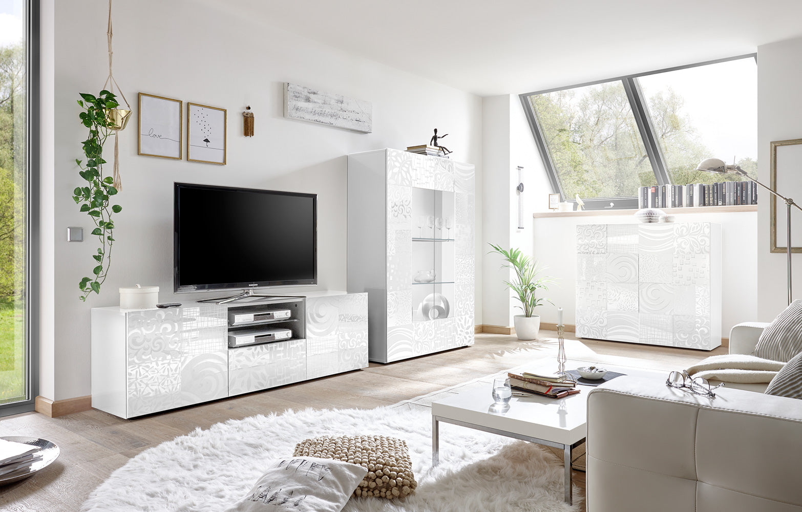 Set di mobili moderni, utili per arredare il salotto o soggiorno, come vetrina, porta tv e credenza due ante. Da notare la bellissima finitura lucida laccata con disegni serigrafati, fruibile nei colori bianco o grigio.