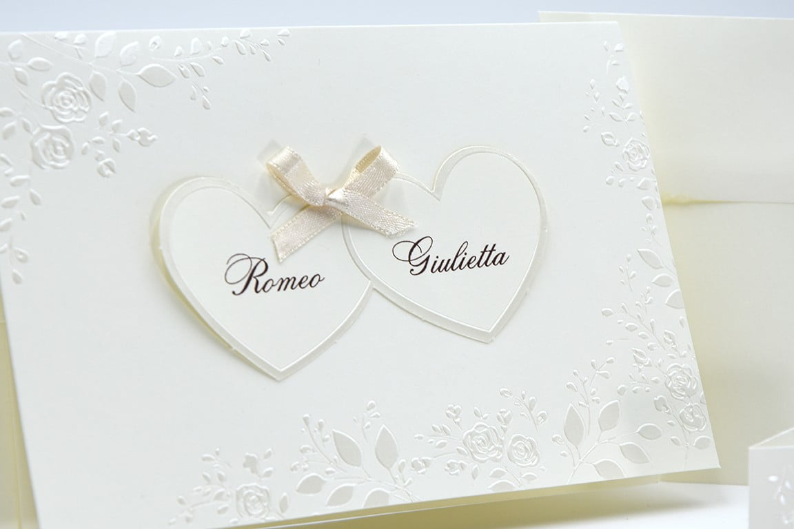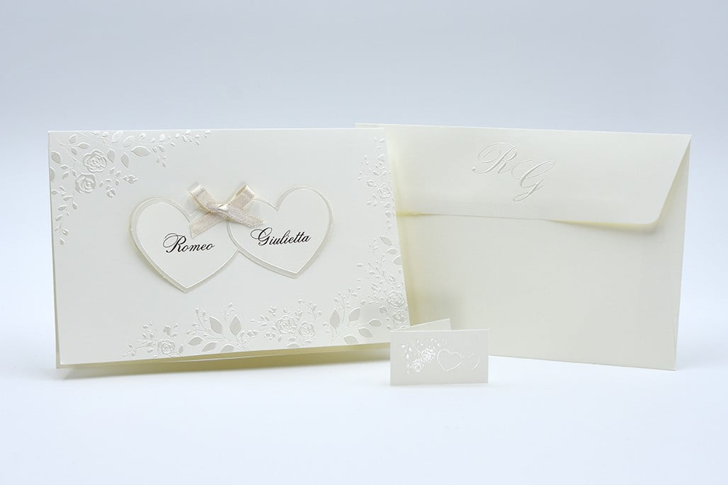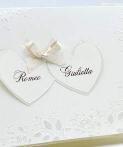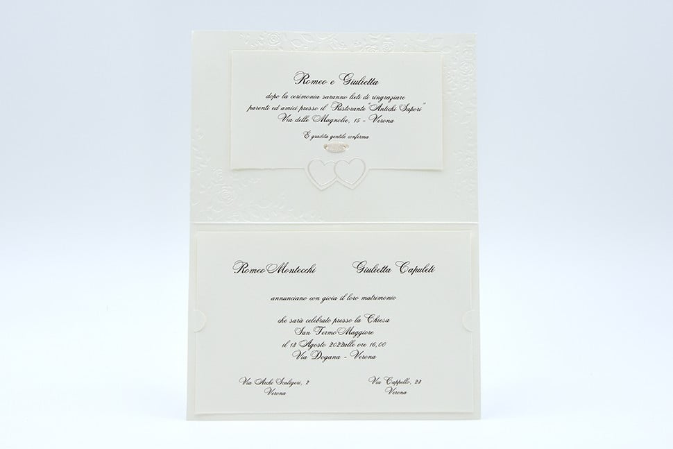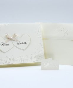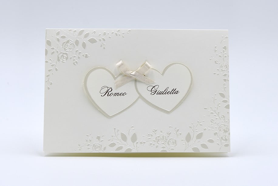 Formato aperto: 170 x 230 mm- Formato chiuso: 115 x 170 mm – Carta avorio 200 gr /mq (interno) – Carta avorio 240 gr /mq (esterno) – Lamina a caldo perlata e rilievo a secco – Nastro doppio raso mm 6 – Busta, nastro, invito e biglietto bomboniera inclusi nel prezzo.