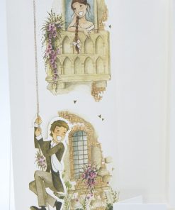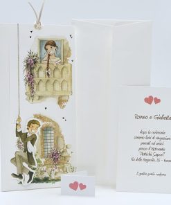 Formato aperto: 310 x 100 mm- Formato chiuso: 210 x 100 mm- Carta bianca 200 gr /mq (interno) – Carta bianca 200 gr /mq (esterno) – Lamina a caldo trasparente lucido – Busta, nastro, invito e biglietto bomboniera inclusi nel prezzo.