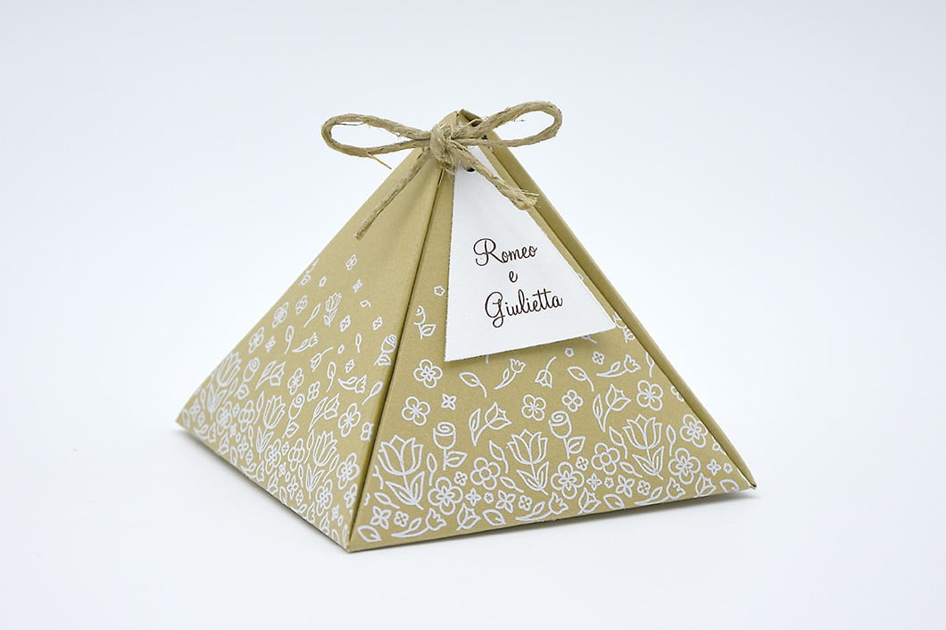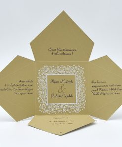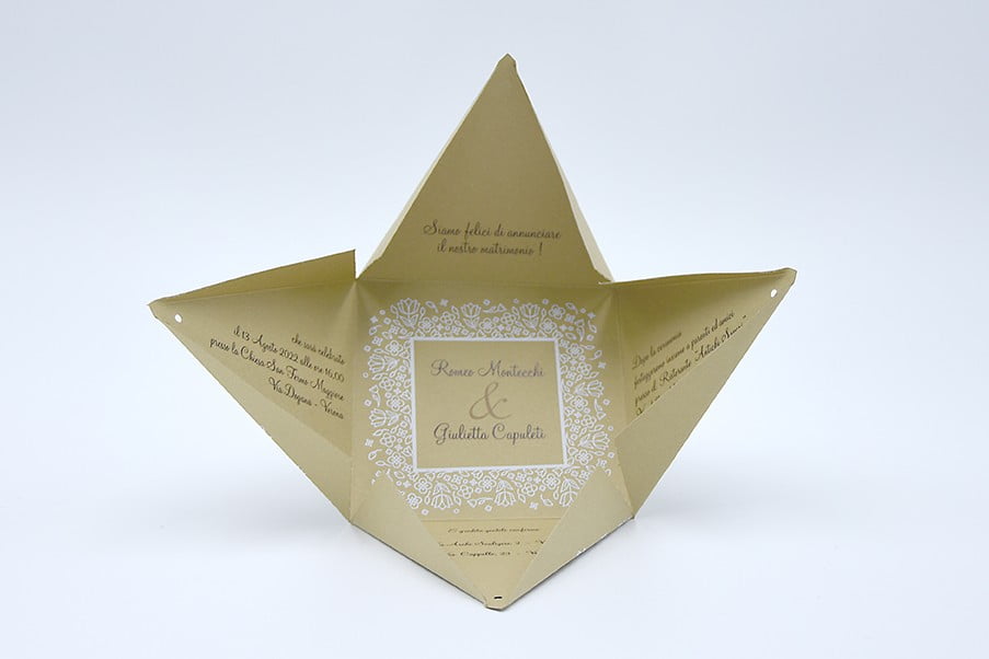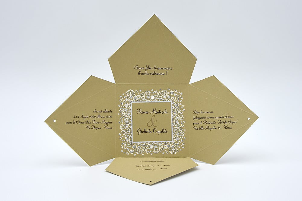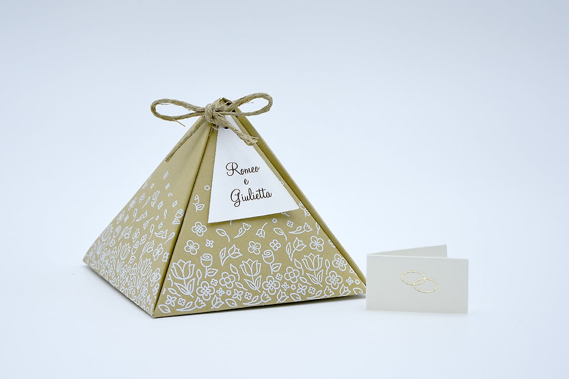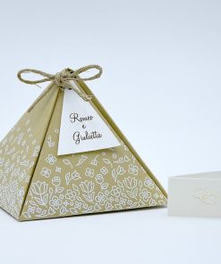Formato aperto: 216×216 mm – Formato chiuso: 80 x 80 x 70 mm – Carta bianca 200 gr /mq (tag) – Carta senape 300 gr /mq (esterno) – Lamina a caldo bianca – Nastro – Busta, tag, nastro e biglietto bomboniera inclusi nel prezzo.