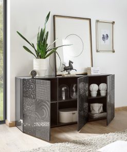 La credenza moderna Pavel presenta un’unica facciata decorata con graziosi disegni serigrafati, in cui si susseguono diverse fantasie geometriche e floreali, creando un aspetto raffinato e unico. Disponibile in due colori lucidi, importanti per sottolineare lo stile moderno, come bianco lucido per chi desidera un ambiente più luminoso, e una splendida versione grigio lucido, estremamente chic e di gran classe.