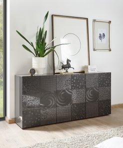 La credenza moderna Pavel presenta un’unica facciata decorata con graziosi disegni serigrafati, in cui si susseguono diverse fantasie geometriche e floreali, creando un aspetto raffinato e unico. Disponibile in due colori lucidi, importanti per sottolineare lo stile moderno, come bianco lucido per chi desidera un ambiente più luminoso, e una splendida versione grigio lucido, estremamente chic e di gran classe.