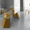 La possente base in metallo con grasse gambe peculiari e stabilizzanti, si accompagna ad un piano che potrà essere realizzato in legno o vetro, con tante finiture disponibili.