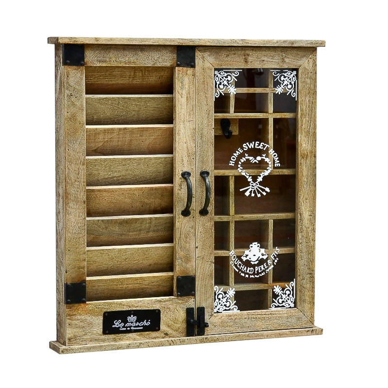 Interessante pensile da parete realizzato in legno di mango, diviso in due parti, una di questa predisposta per accogliere la posta, mentre l’altra, è una bacheca, dove poter inserire piccoli oggetti. Da notare la decorazione dell’anta vetrata con stampe di colore bianco.