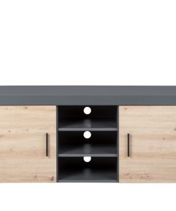 Mobile porta tv con ante laterali e vani centrali realizzato in legno con struttura colore antracite e frontali finitura quercia, un accostamento insolito voluto per creare un contrasto visivo audace. Il nostro porta tv si rivelerà anche funzionale, capiente e spazioso, da abbinare con le credenze, vetrina e altro della stessa linea.