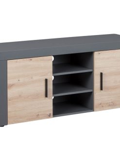 Mobile porta tv con ante laterali e vani centrali realizzato in legno con struttura colore antracite e frontali finitura quercia, un accostamento insolito voluto per creare un contrasto visivo audace. Il nostro porta tv si rivelerà anche funzionale, capiente e spazioso, da abbinare con le credenze, vetrina e altro della stessa linea.