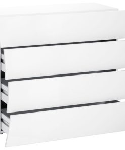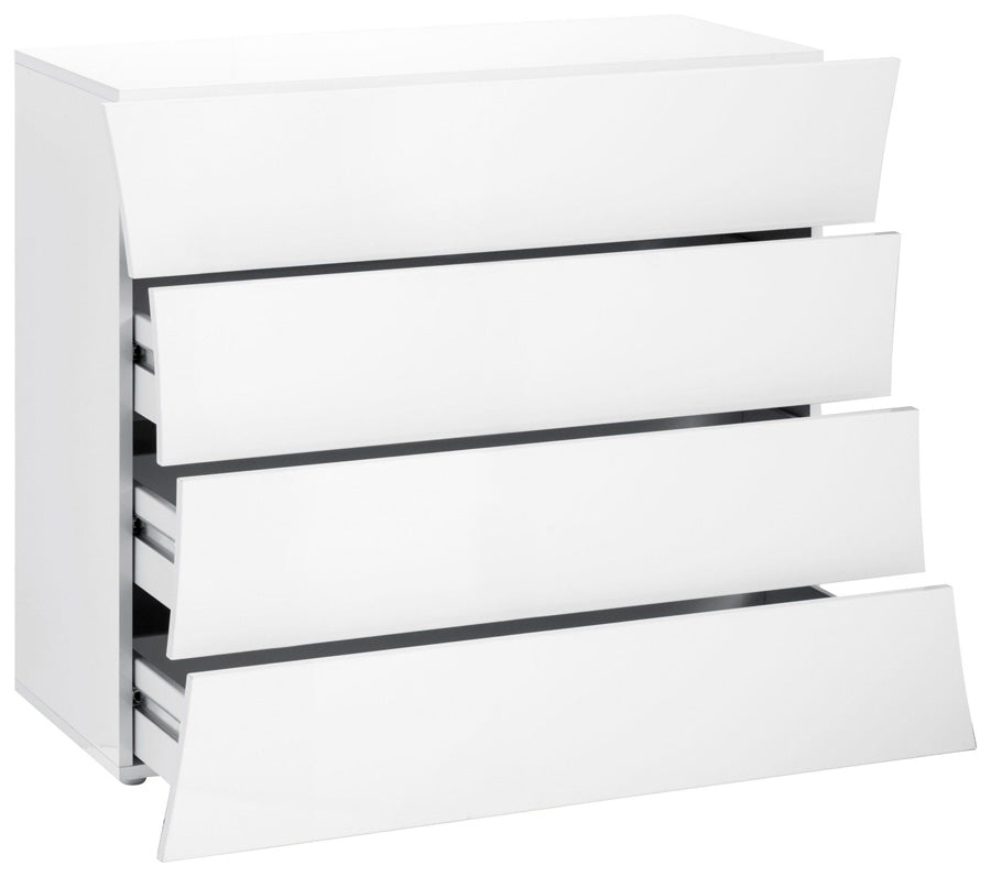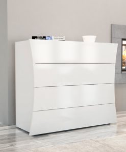 Cassettiera moderna, in legno, colore bianco lucido. Il mobile è dotato di 4 cassetti, con bordi ad arco, perfetto da collocare in camera o soggiorno. Una novità Made in Italy, per una casa elegante e stilosa.