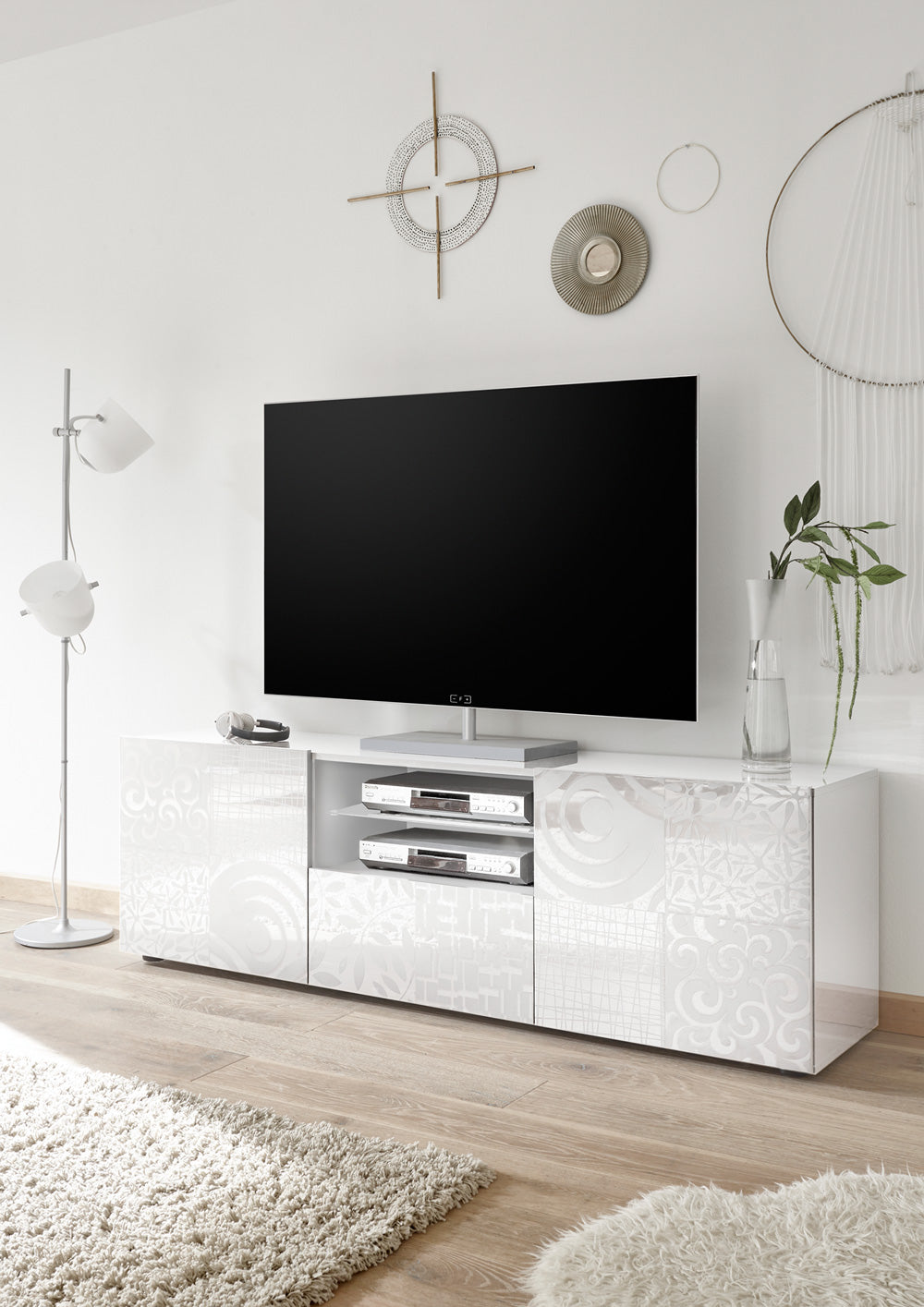 Peter – Porta tv basso moderno finitura lucida con serigrafie cm 181x42x57h – vari colori