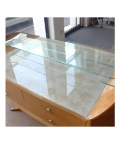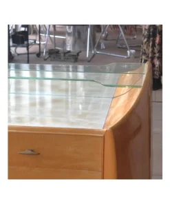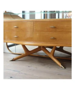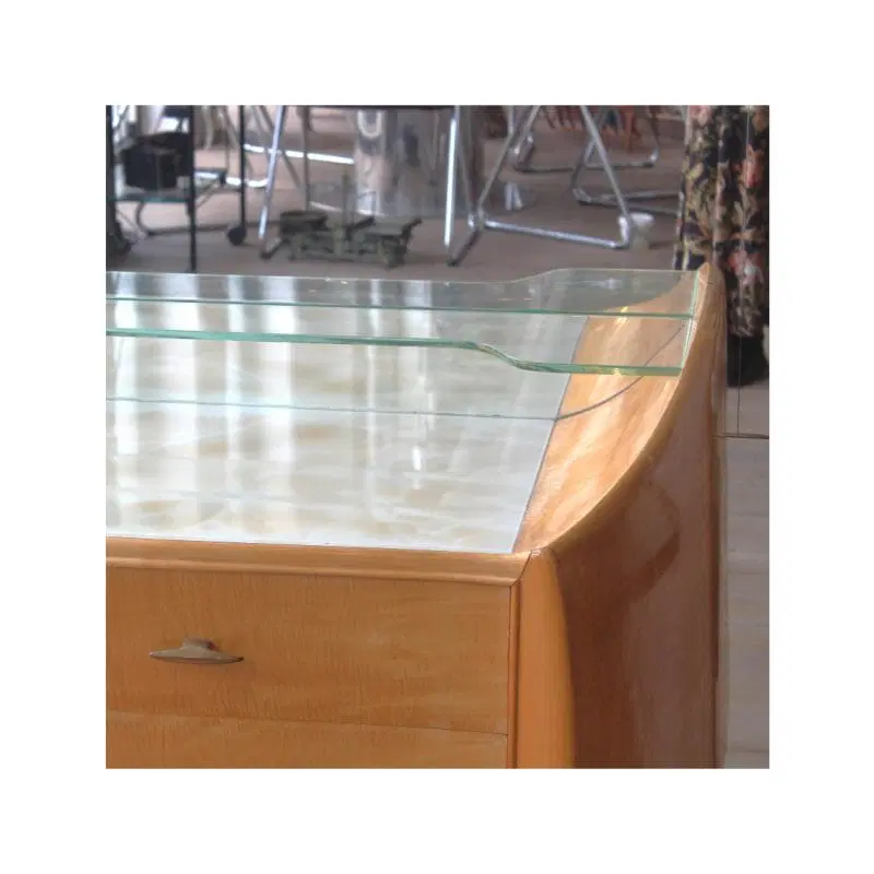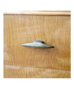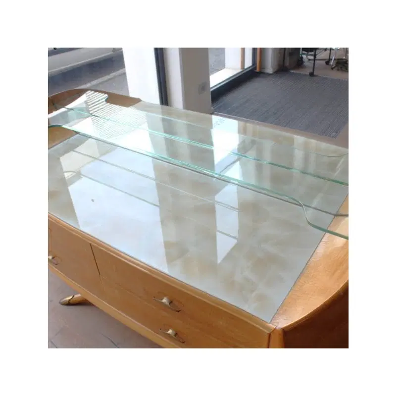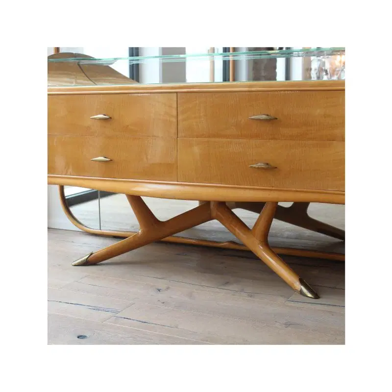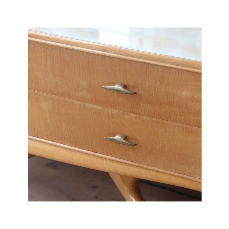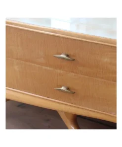 La struttura bombata dei cassetti, realizzata in legno chiaro lucido, aggiunge movimento e morbidezza al disegno, mentre le maniglie e i piedini in ottone donano un tocco prezioso e luminoso. Il basamento incrociato, anch’esso in legno, sostiene il mobile con leggerezza e carattere. La base del piano ha un vetro marmorizzato sui toni verde acqua e del miele.