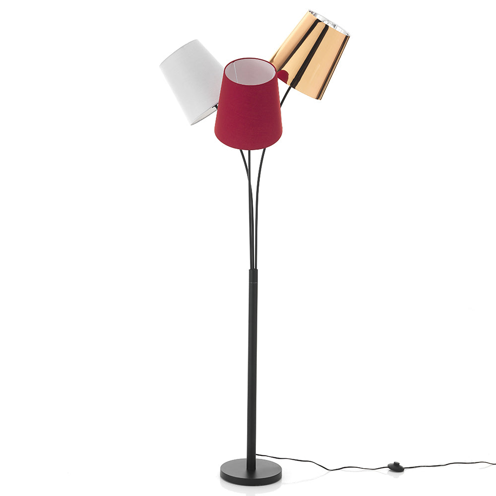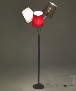 Singolare lampada da terra distinta da 3 paralumi classici che realizzano però un design moderno e originale. Si compone di asta in metallo nero e 3 coprilampada differenti: due in tessuto colorato e uno in pvc dorato.