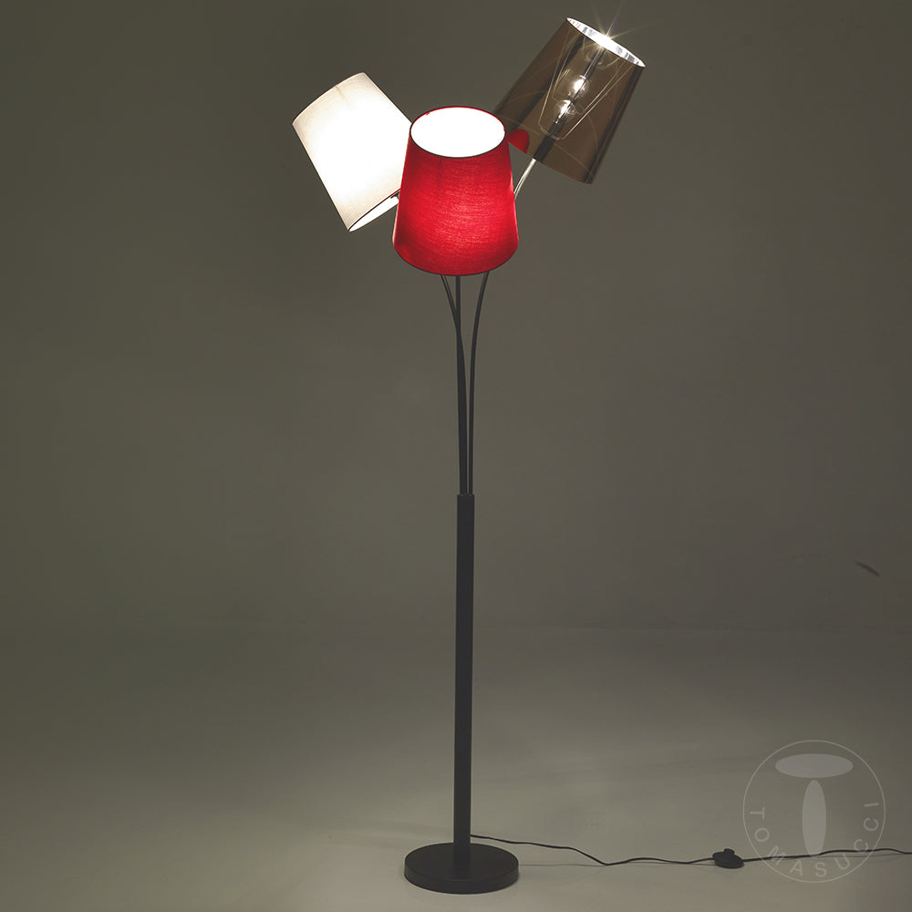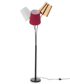 Divertente e originale piantana da terra caratterizzata dalla presenza di 3 paralumi tradizionali, diversi nei colori e nei materiali. Infatti due coprilampada sono realizzati in tessuto, uno bianco e l’altro rosso, mentre il terzo paralume si presenta in pvc dorato. Quando questa singolare lampada si accende l’effetto è suggestivo, ideale per creare una luce soffusa nel salotto affianco al divano o in camera da letto.