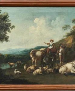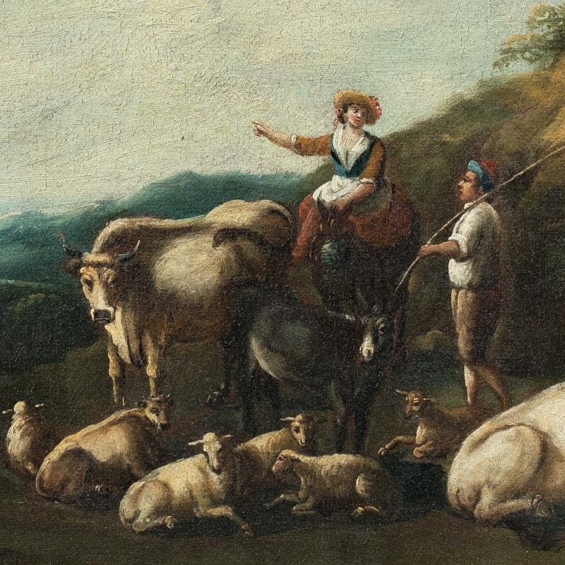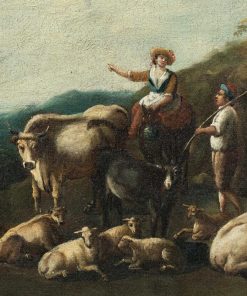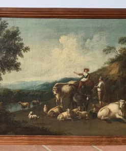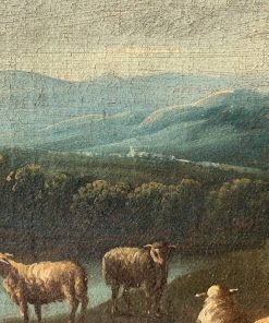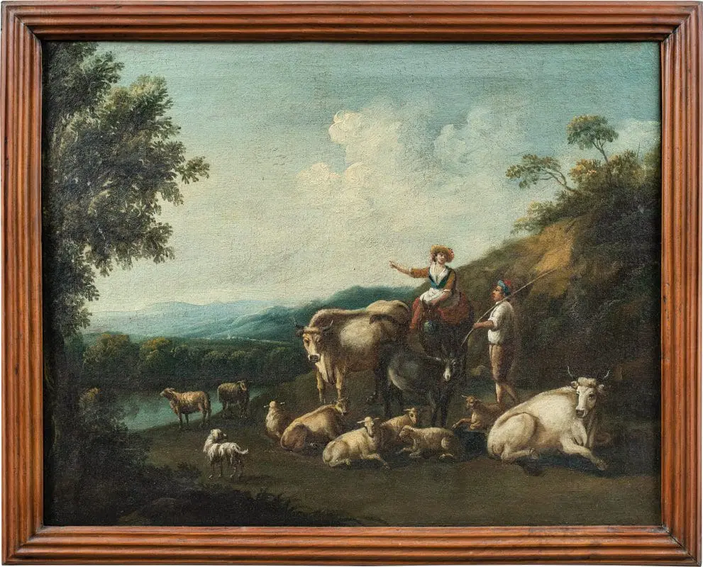 Pittore italiano (XVIII sec.) – Paesaggio arcadico con gregge e pastori.