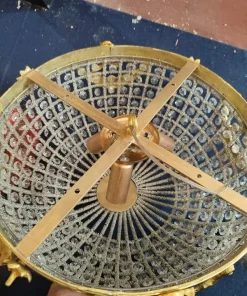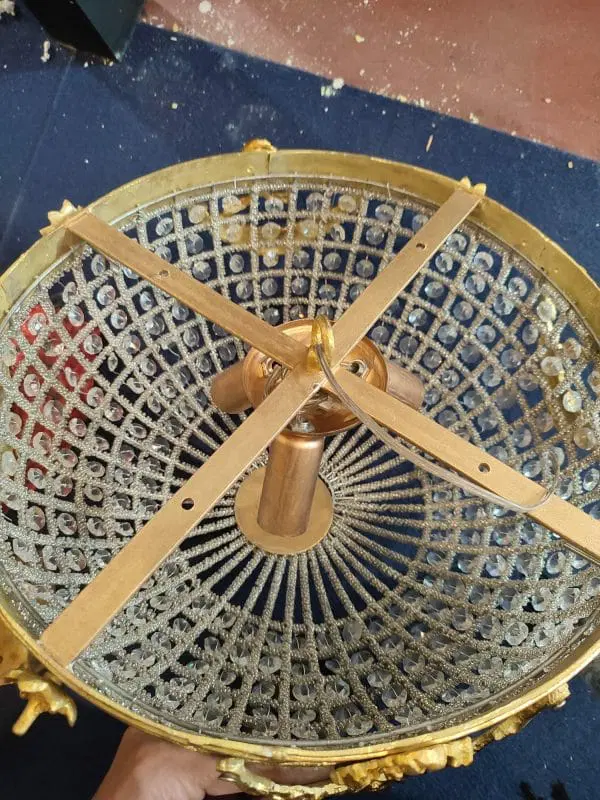 Plafoniera stile impero anni 70 in bronzo con prismi di vetro legati a mano.