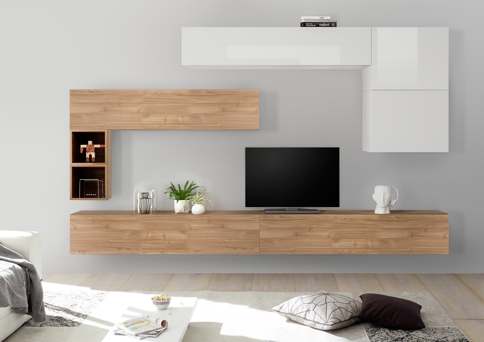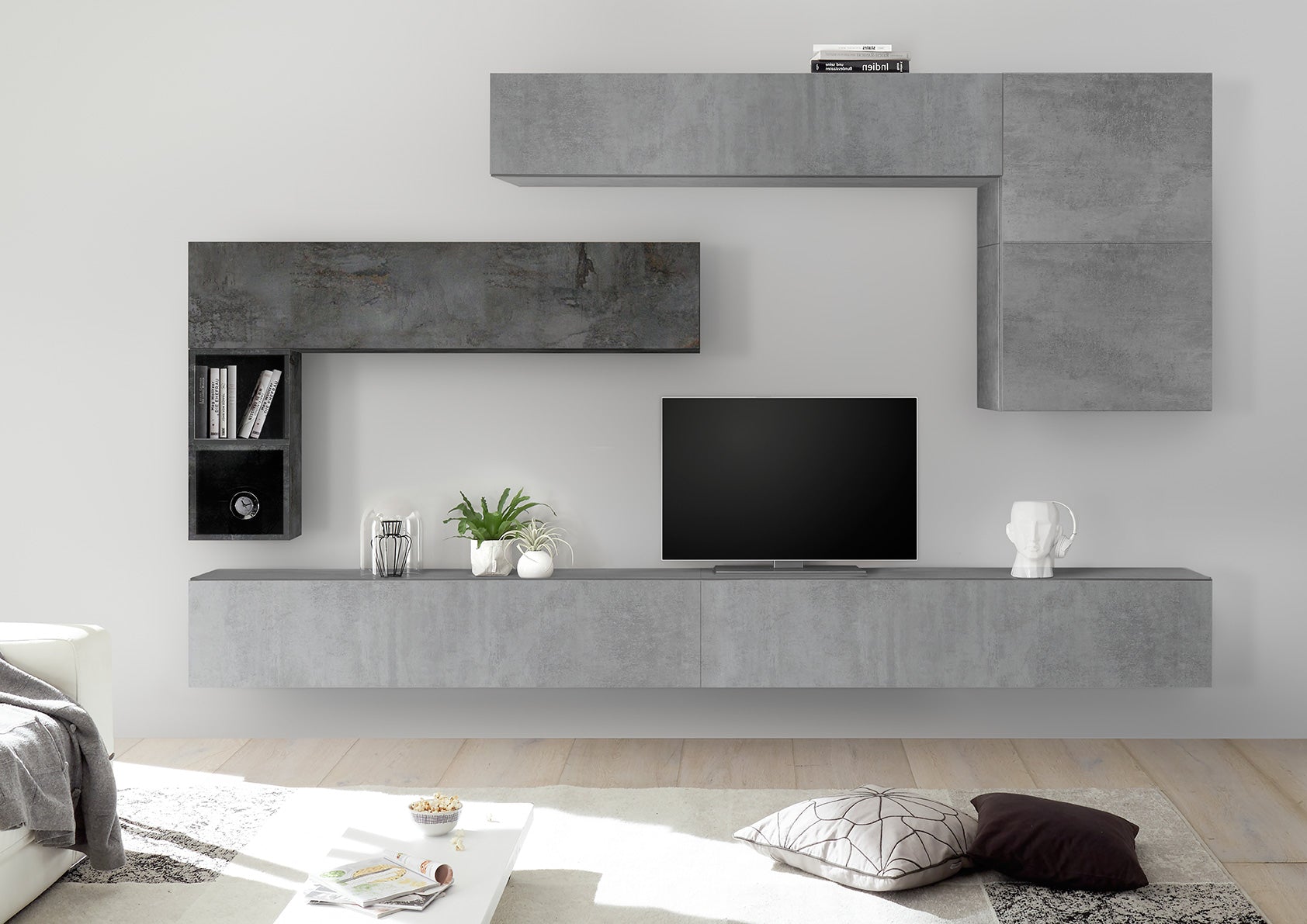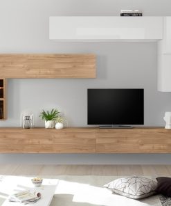 Arredare il soggiorno con una parete componibile come questa, è sicuramente la scelta più versatile ed economica, in quanto, consente di ottimizzare gli spazi, e di impostare la struttura a proprio piacimento. La praticità della parete moderna Polidoro, no finisce qui, dal momento che è composta da tutti pensili sospesi, spaziosi, caratterizzati dal design basic, con finiture alternate tra bianco laccato lucido e, a scelta, noce stelvio, noce dark, cemento o ossido.