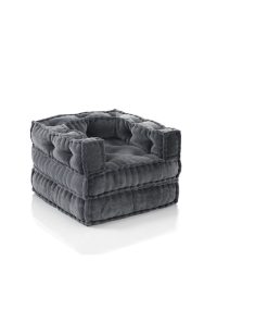 Deliziosa poltrona da terra riccamente imbottita e soffice, formata da due elementi, come poltrona angolare e cuscino quadrato, si può impiegare come poltrona o come chaise longue. Si differenzia per il rivestimento in cotone vellutato, colore grigio.
