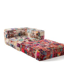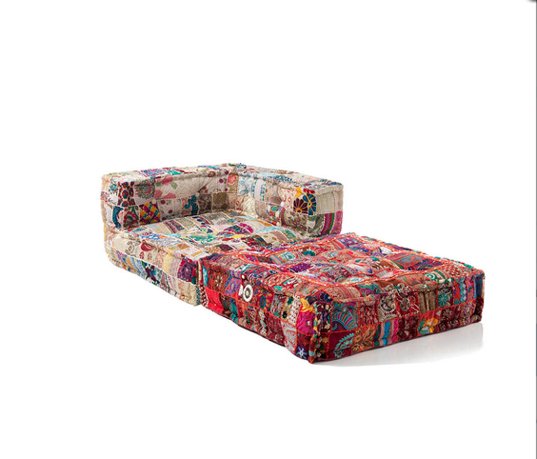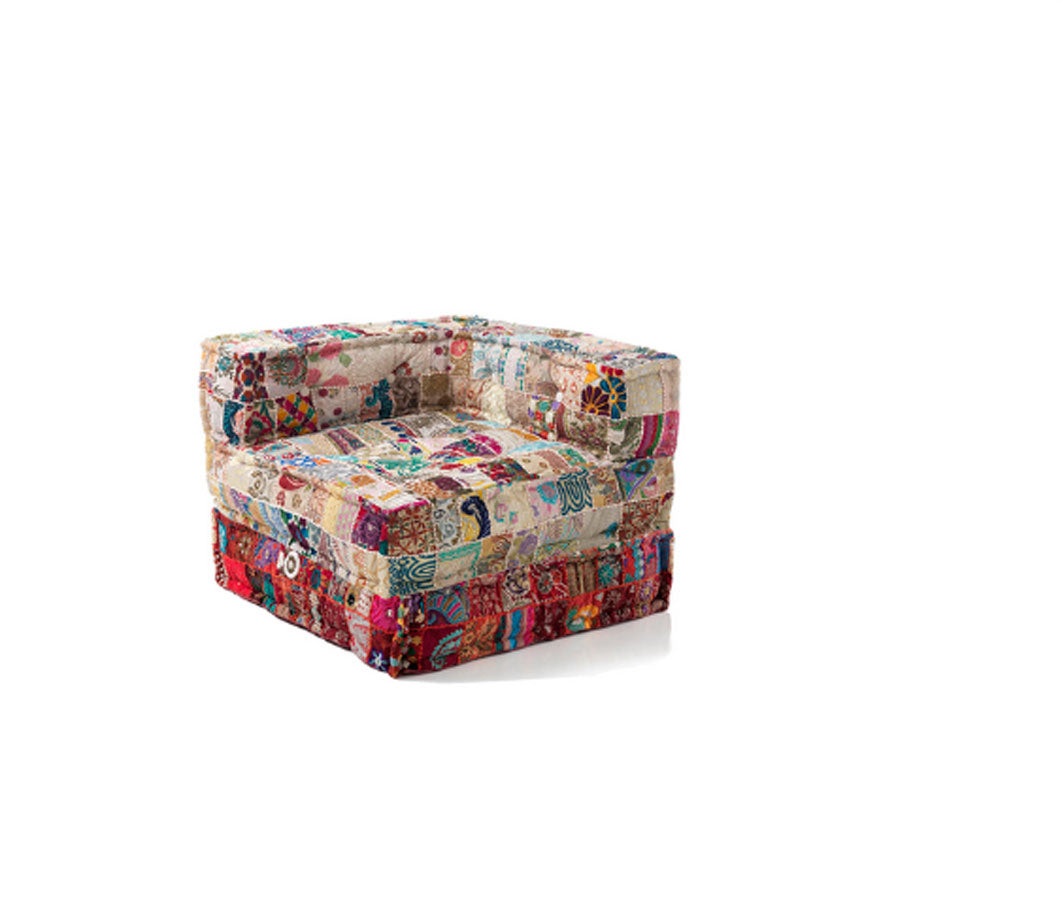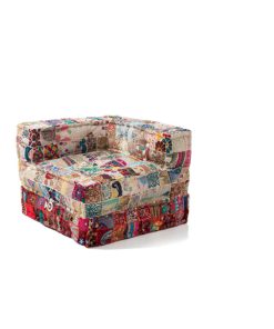 Divano angolare imbottito con fibre in stoffa, composto da due elementi: una poltrona angolare e un cuscino da terra, da posizionare uno sull’altro o affiancati, per realizzare una comoda chaise longue. Questa seduta si caratterizza per il rivestimento in tessuto con tecnica patchwork, con molteplici colori e fantasia.
