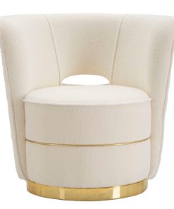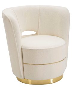 Poltrona moderna dalla forma circolare rivestita in morbido tessuto colore crema, un modello innovativo esempio di design di tendenza e ultra chic. Il particolare schienale è arricchito da un foro centrale, e la presenza della base in metallo dorato sottolinea l’assoluta eleganza di questa comoda seduta, da collocare nel salotto o camera.