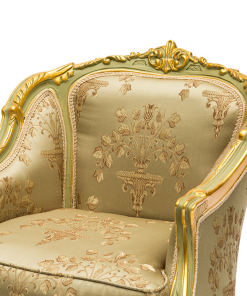 Bellissima e raffinata poltrona da camera o salotto ideale per arricchire con stile la tua casa, non rinunciando al comfort che offre. Il divano classico è realizzato in legno colore verde e lucenti sfumature oro, mentre il rivestimento è ricamato a filo.