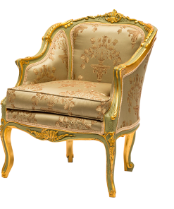 Bellissima e raffinata poltrona da camera o salotto ideale per arricchire con stile la tua casa, non rinunciando al comfort che offre. Il divano classico è realizzato in legno colore verde e lucenti sfumature oro, mentre il rivestimento è ricamato a filo.