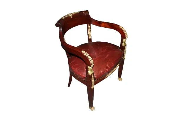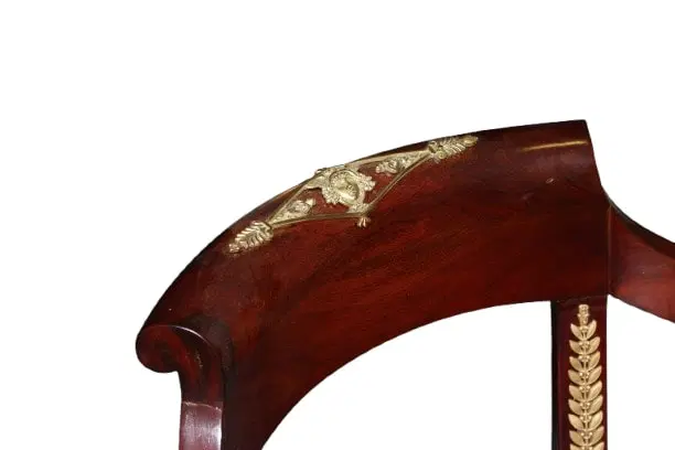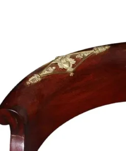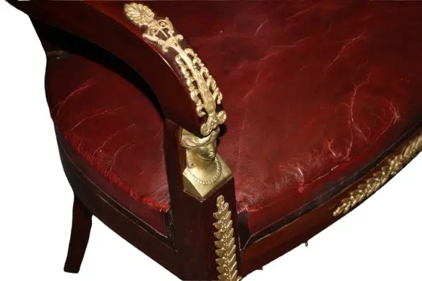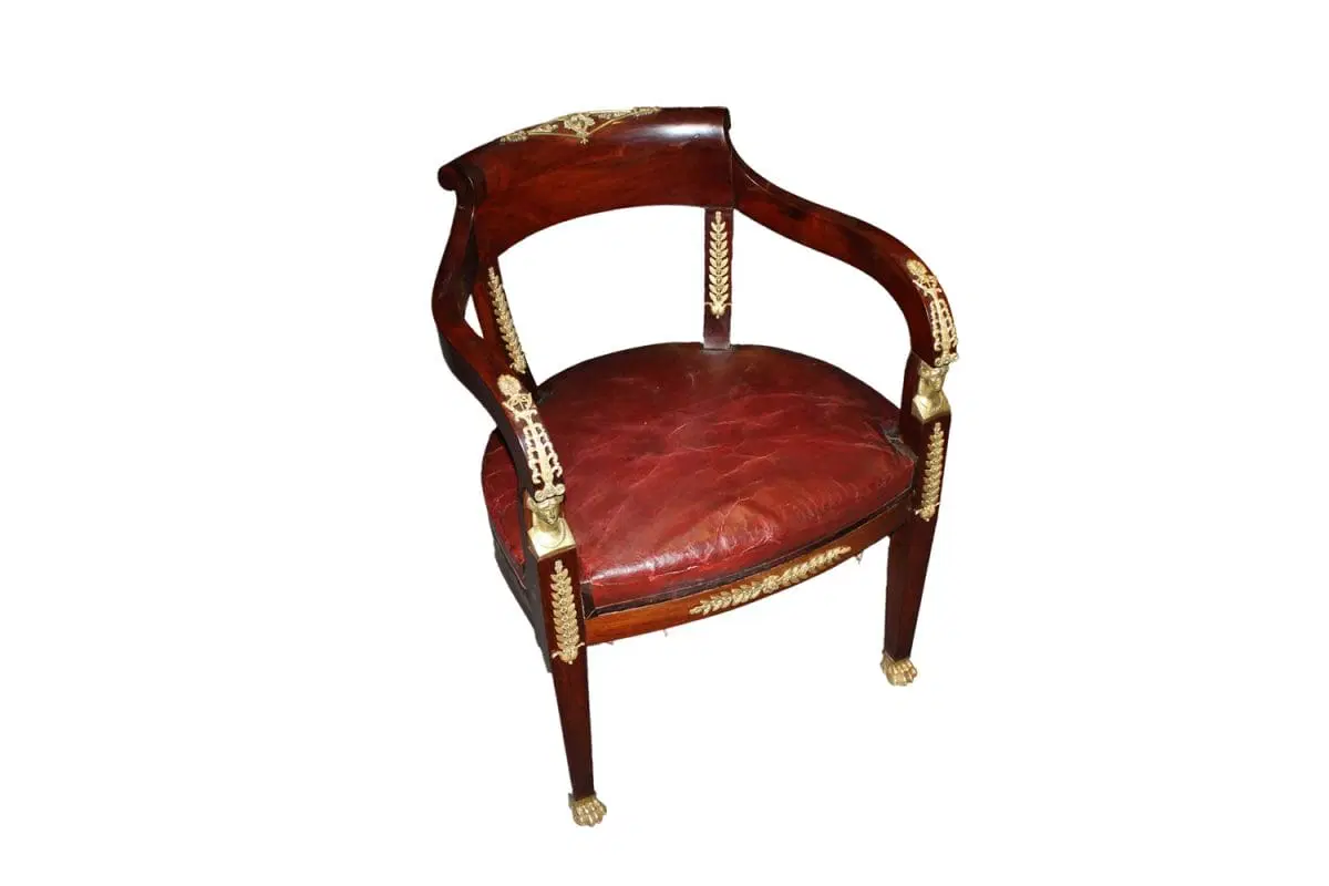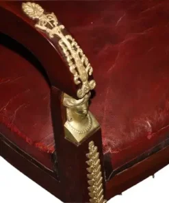 Bellissima poltrona francese di metà 1800 stile Impero in legno di mogano. Presenta ricche applicazioni in bronzo dotato e seduta in pelle.