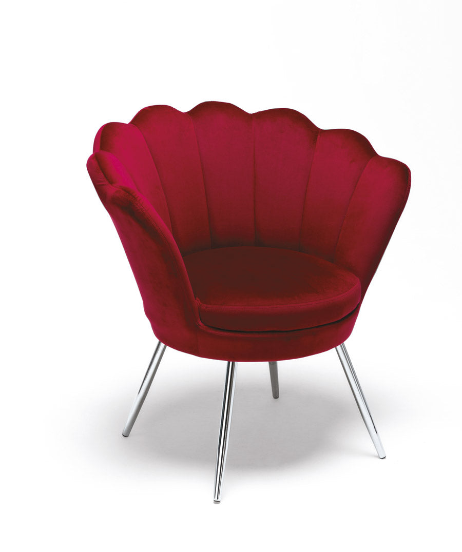 Strepitosa poltrona design resa unica per mezzo dalla particolare quanto avvolgente forma della seduta a fiore. Rivestita in velluto con comoda imbottitura, la poltrona moderna presenta gambe in acciaio disponibile nel colore agrneto o oro dalla forma affusolata.