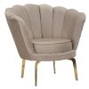 Poltroncina imbottita e rivestita in tessuto, un modello che riprende una linea molto in voga come quella del fiore. Infatti, la forma dello schienale tondo è sagomato seguendo una delicata forma dei petali tracciati da cuciture verticali che segnano il rivestimento in tessuto. Da notare l’abbinamento di tessuto monocolore e graziosa fantasia tono su tono, assieme alle gambe in metallo dorato che marcano la signorilità di questa poltroncina da salotto.