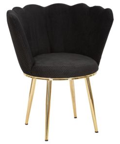 Elegantissima poltroncina utile per arredare il salotto o da posizionare nell’ingresso affianco ad una consolle o tavolino. La sedia design ripercorre nelle sue forme tonde, la sagoma di un fiore, evidente nello schienale avvolgente con rivestimento accompagnato da cuciture verticali. Le gambe sono realizzate in raffinato metallo colore oro, mentre il rivestimento della seduta in tessuto a tinta unita per lo schienale e a fantasia la parte restante, disponibile in colore nero o crema.