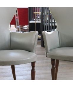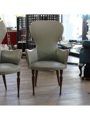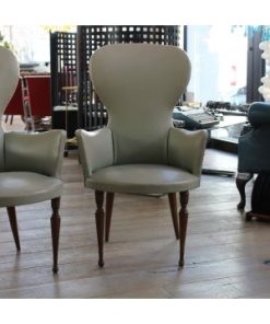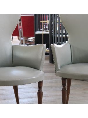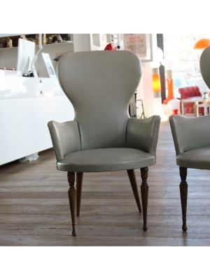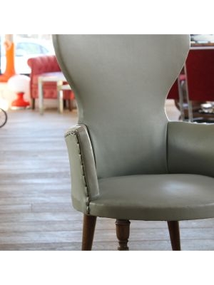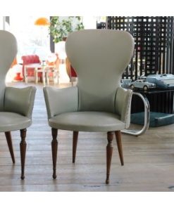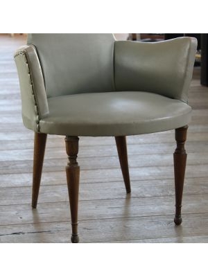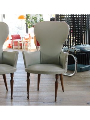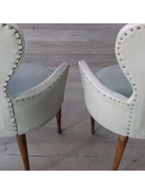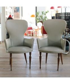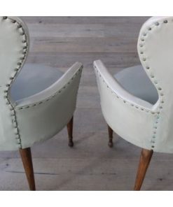 Modello: Poltroncine borchiate (in coppia) / Due piccoli petali vintage pronti ad accoglierti: queste poltroncine anni 50-60, compatte ma ricche di stile, uniscono eleganza sartoriale e praticità quotidiana. Il loro schienale alto e avvolgente ricorda una corolla che si chiude su se stessa, mentre le borchie decorative ne delineano con decisione il profilo.