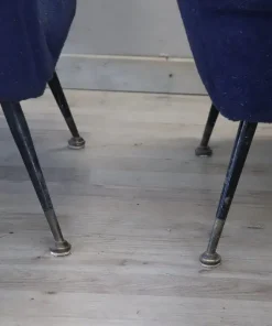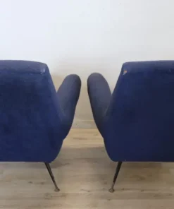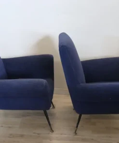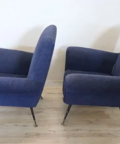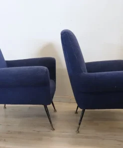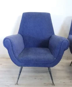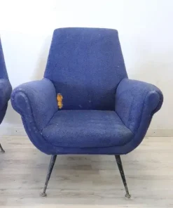 coppia di poltrone design italiano anni 1950. Gambe originali in ferro e piedi in ottone con imbottitura in spugna e rivestimento in lana bouclé blu. Questa coppia di poltrone è stata creata da Gigi Radice per Minotti. Evidente usura. Si consiglia di sostituire l’imbottitura della seduta e il tessuto. prezzo trattabile vi invitiamo ad inviarci le vostre proposte di acquisto le valuteremo con piacere.