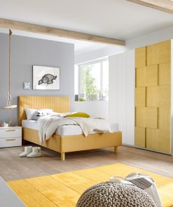 Composizione per cameretta singola Popart, con letto singolo una piazza e mezza, comodino e armadio con 2 ante scorrevoli, una soluzione funzionale, pronta all’uso e che colora la stanza dei vostri bambini. Popart comprende l’armadio moderno Brizio con la sua accattivante anta ad effetto scacchiera, comodino due cassetti e letto con testiera alta caratterizzata dalle cuciture verticali del rivestimento. Potrai scegliere il colore tra bianco opaco, blu e grigio artico.