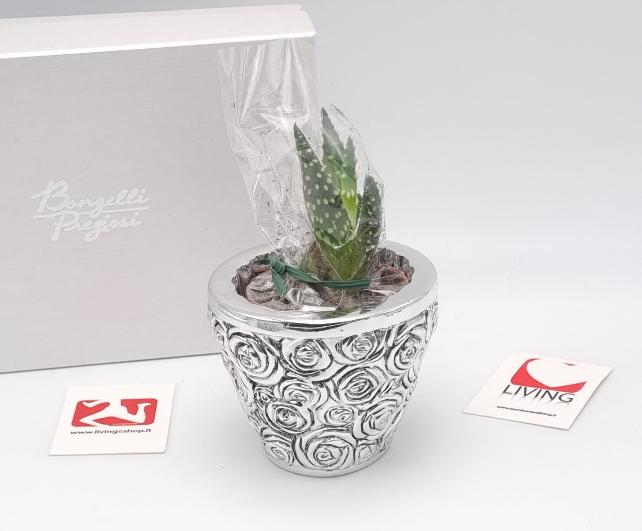 Porta piante in resina argentata con decoro rose compresa di piantina grassa e astuccio firmato BONGELLI Made in Italy