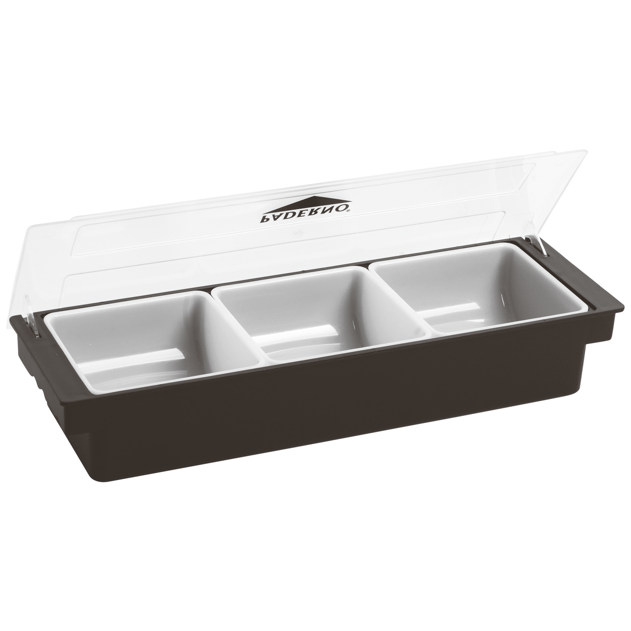 Il portacondimenti a tre vaschette Paderno è un must-have per ogni professionista della ristorazione. Realizzato in resistente ABS, questo pratico contenitore ti permette di avere sempre a portata di mano tutto ciò che ti serve per preparare piatti gustosi e invitanti. Le tre vaschette, di dimensioni generose, sono ideali per conservare salse, condimenti, guarnizioni e ingredienti per insalate. Grazie al coperchio, potrai proteggere il contenuto da polvere e umidità, mantenendo gli alimenti freschi più a lungo. La pulizia è semplicissima: le vaschette sono infatti lavabili in lavastoviglie, permettendoti di risparmiare tempo e fatica. Con il portacondimenti Paderno, la tua cucina sarà sempre organizzata e funzionale. Dalle salse per hamburger alle guarnizioni per cocktail, ogni ingrediente troverà il suo posto perfetto.