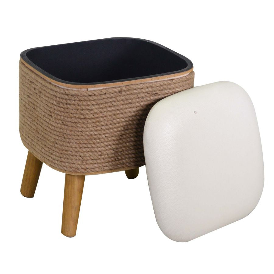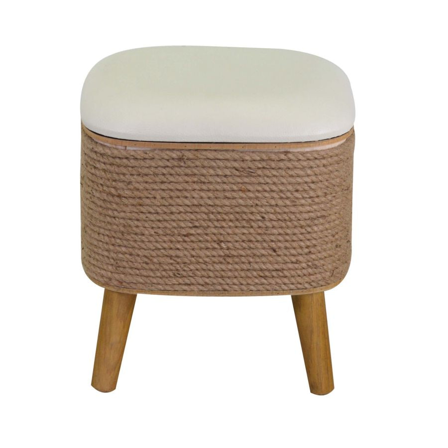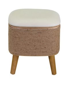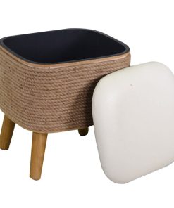 Pouf contenitore inseribile in ambienti grunge e country, si caratterizza per la presenza della corda con seduta in ecopelle colore bianco.