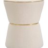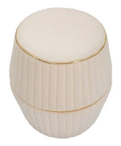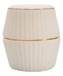 Pouf sgabello rotondo perfetto per accompagnare il tuo divano nel salotto, o ancor meglio una poltrona della stessa linea. Questo delicato pouf si contraddistingue per il rivestimento in tessuto colore crema lavorato tipo bouclé per generare un tessuto morbido e soffice al tatto. Da notare le cuciture verticali e gli inserti dorati che aggiungono un tocco elegante e raffinato a questo piccolo complemento.