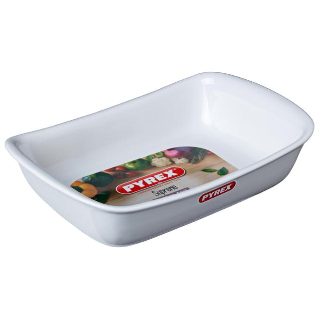 Articolo facente parte della gamma di ceramiche Pyrex Supreme di stoviglie da forno, teglia di color bianco perfetto per la cucina di tutti i giorni. Il bordo spesso consente una presa facile quando si estrae la teglia dal forno.