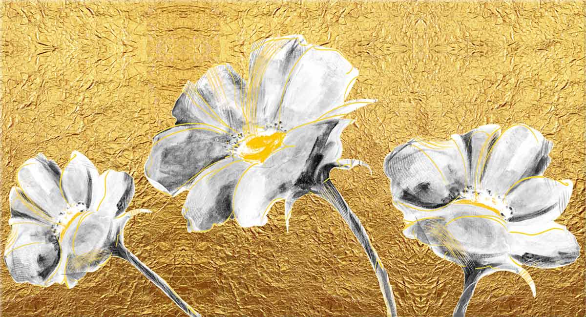 Quadro rettangolare da parete composto con uno stampato su tela. Il pannello raffigura dei delicati fiori bianchi posizionandoli su uno sfondo creato attraverso l’utilizzo di una delicata ed elegante foglia oro. La composizione risplende per la sua bellezza e si adatta, grazie ad un design molto moderno, ad ogni genere di ambiente.