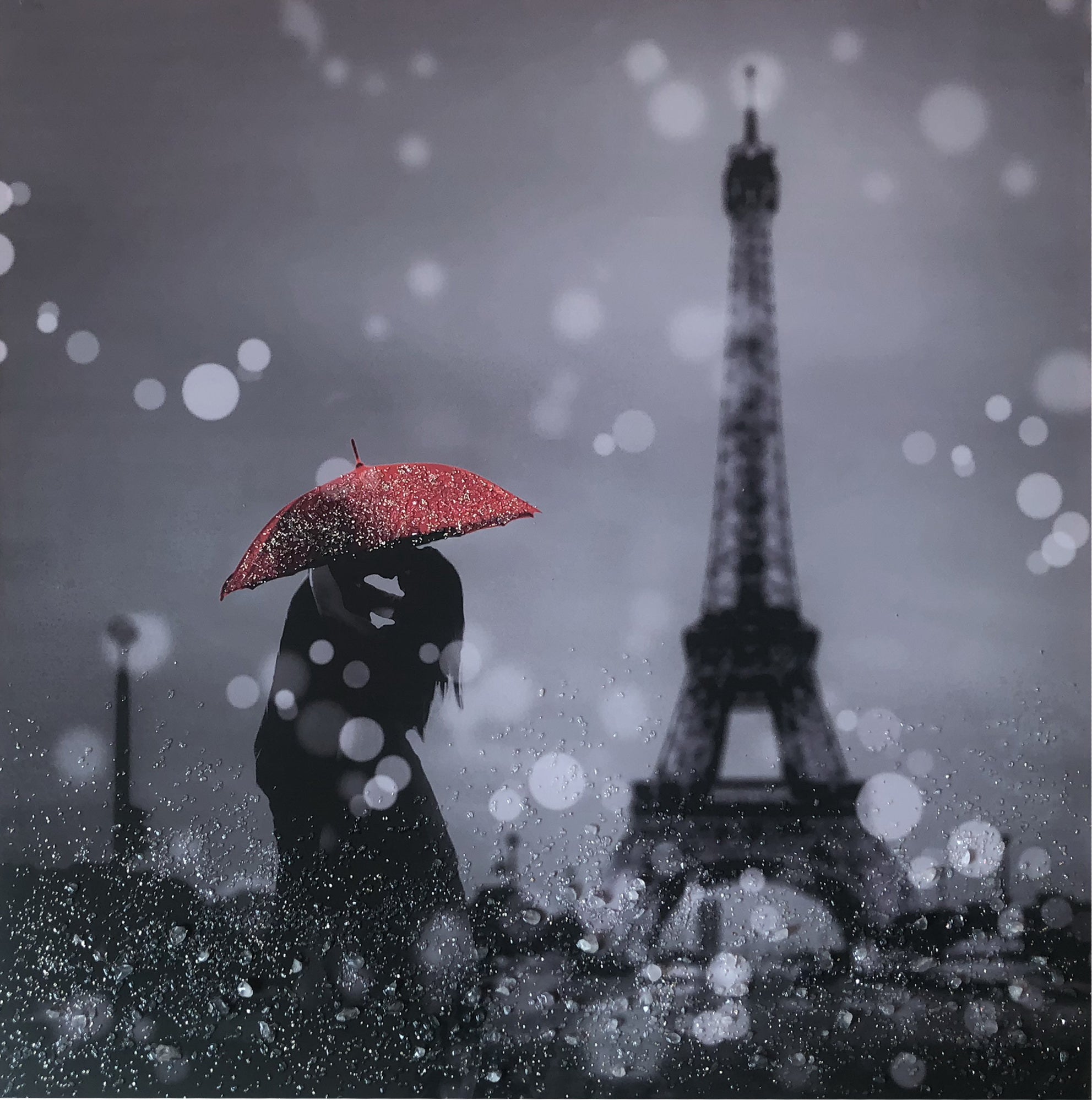 Quadro da parete realizzato attraverso tecnica di stampa con raffigurazione d’amore. Il quadro mostra una coppia di innamorati sotto il cielo piovoso di Parigi. I colori scelti per la composizione appartengono ad una fascia di effetti in bianco e nero, con la particolare eccezione di un dettaglio di colore rosso, che rappresenta appunto l’amore. Il quadro è decorato da cristalli che rievocano la pioggia e creano luminosità.