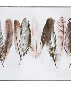 Quadro con stampa su tela, la quale ritrae delle piume, colore nero e oro. La tela è collocata su una struttura in legno, con cornice in PVC. Un complemento d’arredo dal design moderno e raffinato.