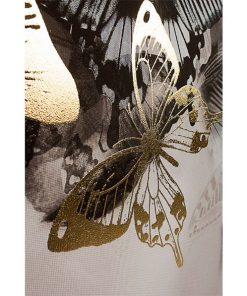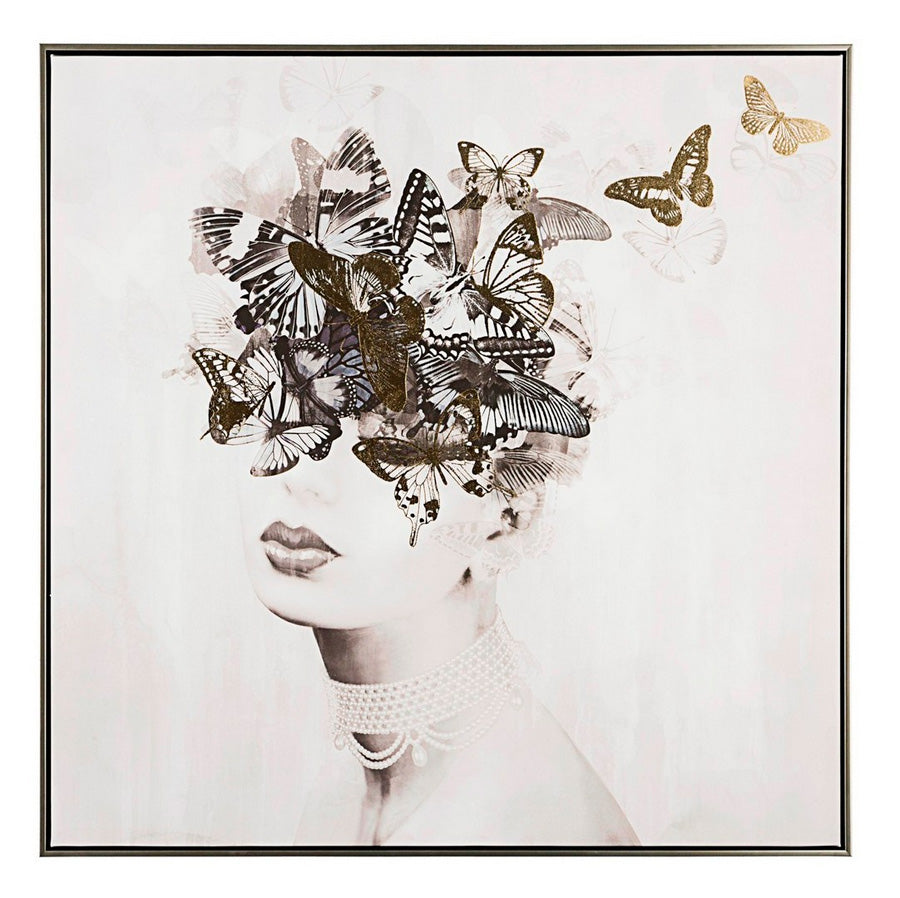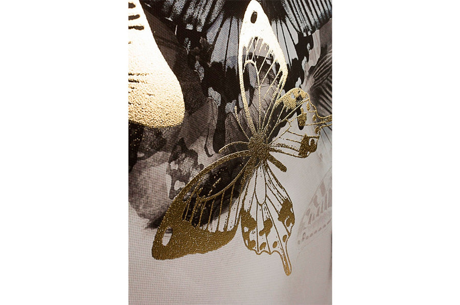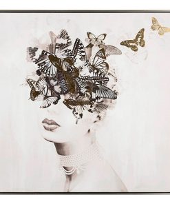Dipinto a mano su tela, con struttura in legno e cornice nera. Il disegno presenta delle sfumature in oro e raffigura una donna, che dissolvendosi, si trasforma in farfalle. Un complemento particolare ed elegante, per un arredamento originale.