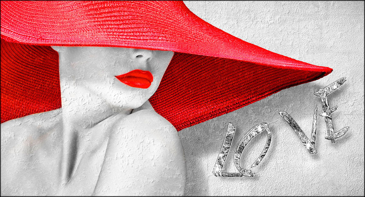 Pannello design in tela stampata di colore bianco e rosso. Il quadro si presenta come una tela stampata dal telaio in legno con raffigurazione di una donna con un maestoso cappello e delle labbra di colore rosso con su una particolare scritta Love dal look moderno. Il quadro viene realizzato con un fondo materico per ricreare un effetto di pittura a mano, dove i colori riescono a definire e completare una composizione moderna consentendogli di adattarsi in qualsiasi tipo di ambiente.