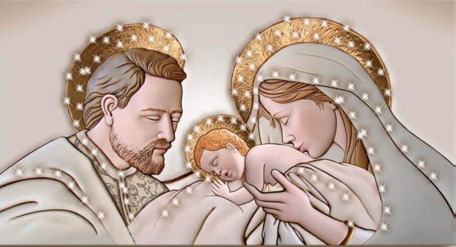 Quadro da parete moderno realizzato con una tecnica di stampa su tela in cotone. Il quadro raffigura la Famiglia Santa attraverso una composizione dall’effetto ceramica, dove i colori vividi rendono il quadro realistico e la decorazione ottenuta con dei cristalli preziosi offrono una luminosità ed una brillantezza unica capace di rendere questo modello un elemento perfetto per la tua camera da letto.