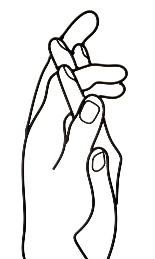 Sobrio ed essenziale quadro moderno realizzato in metallo e raffigurante due mani intrecciate con una sottile cornicetta. Una semplice linea in metallo traccia questa semplice e dolce figura che sembrerà disegnata direttamente sulla vostra parete.