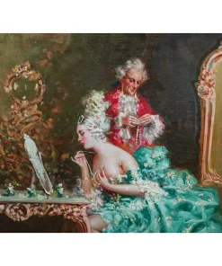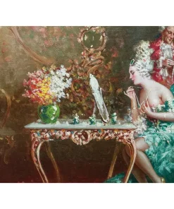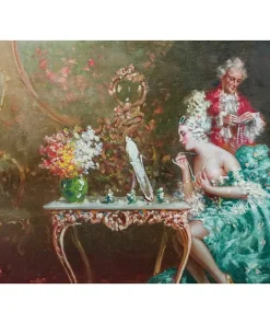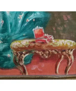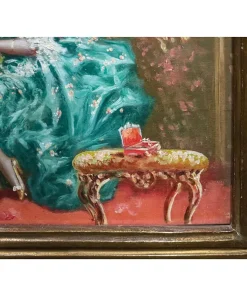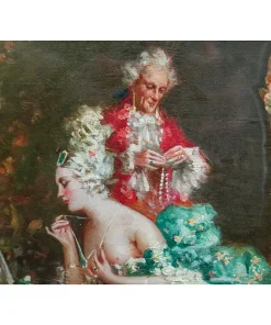 Dipinto olio su compensato entro cornice in legno dorato, firmato dall’autore in basso a sinistra. In questo quadro ritroviamo tutti i caratteri di quella pittura di genere, che si dedicò tra la fine dell’Ottocento e l’inizio del Novecento alle scene in costume. Caratteristica fondamentale di quest’opera è la piacevolezza unita a colori squillanti, con effetti coloristici propri di un artista perfettamente padrone della sua arte.