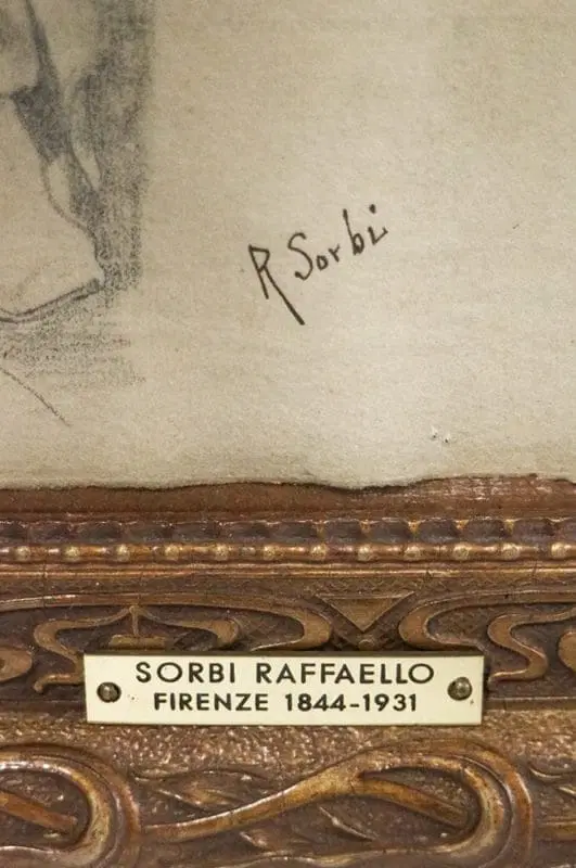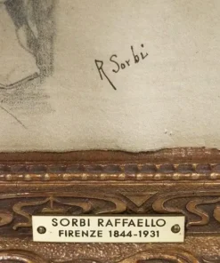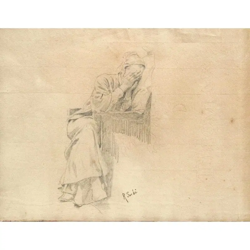 Disegno a matita su carta, entro cornice, firmato dall’autore (R. Sorbi) in basso al centro.