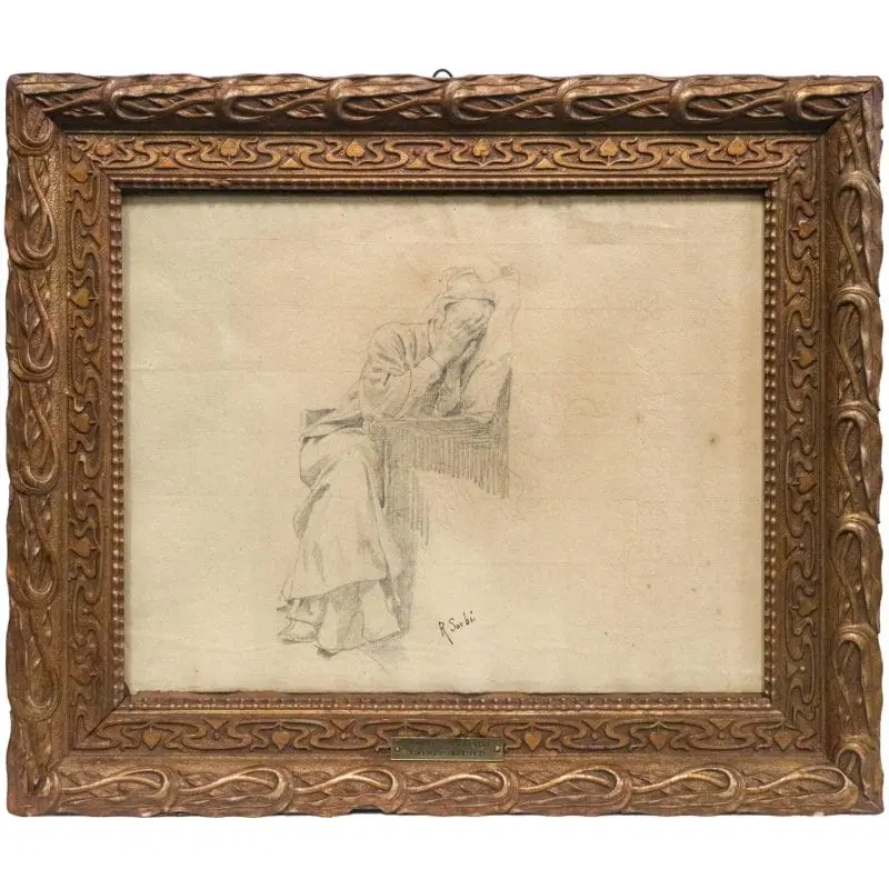 Raffaello Sorbi (Firenze, 1844-1931), Il Riposo di Dante (Bozzetto preparatorio), matita su carta, con cornice