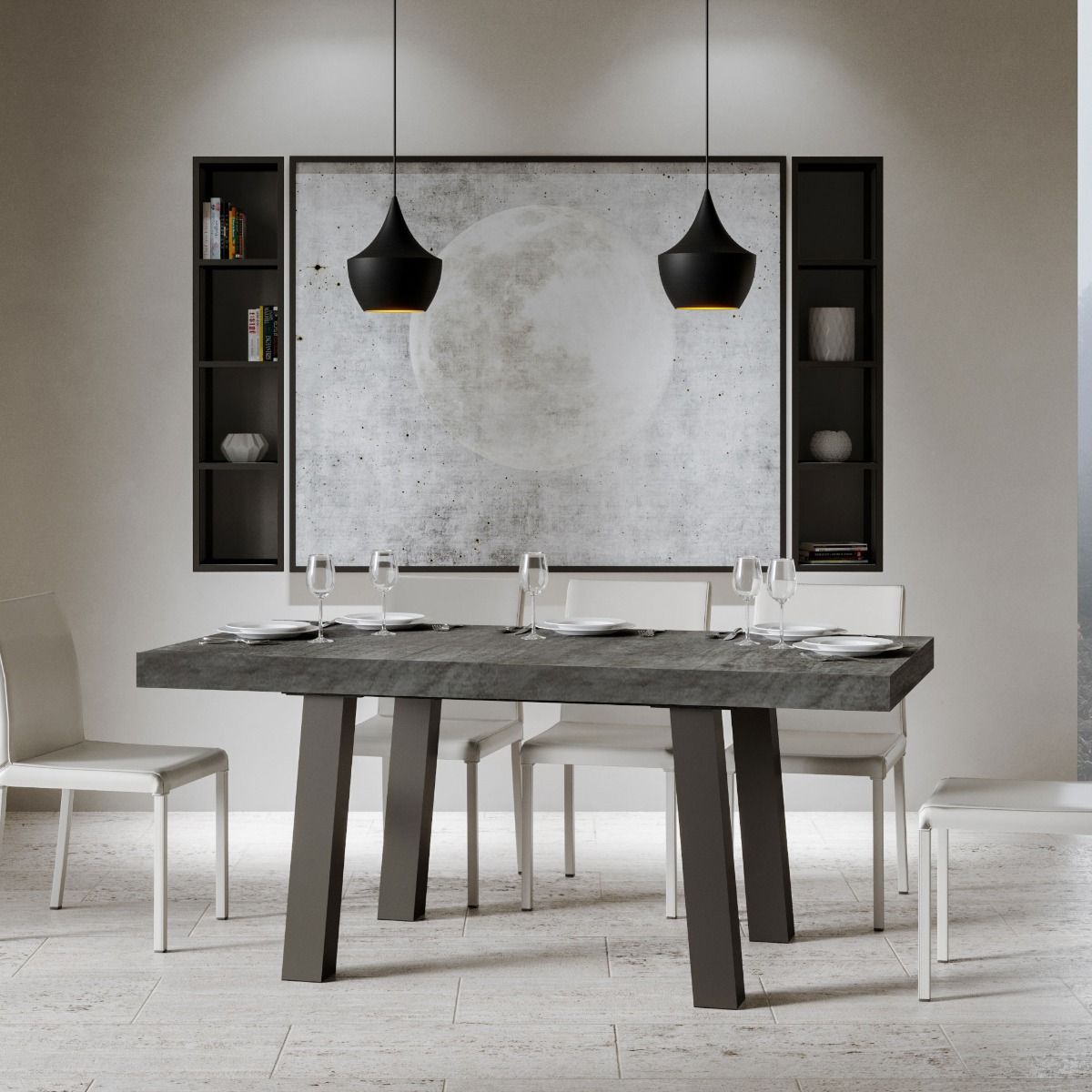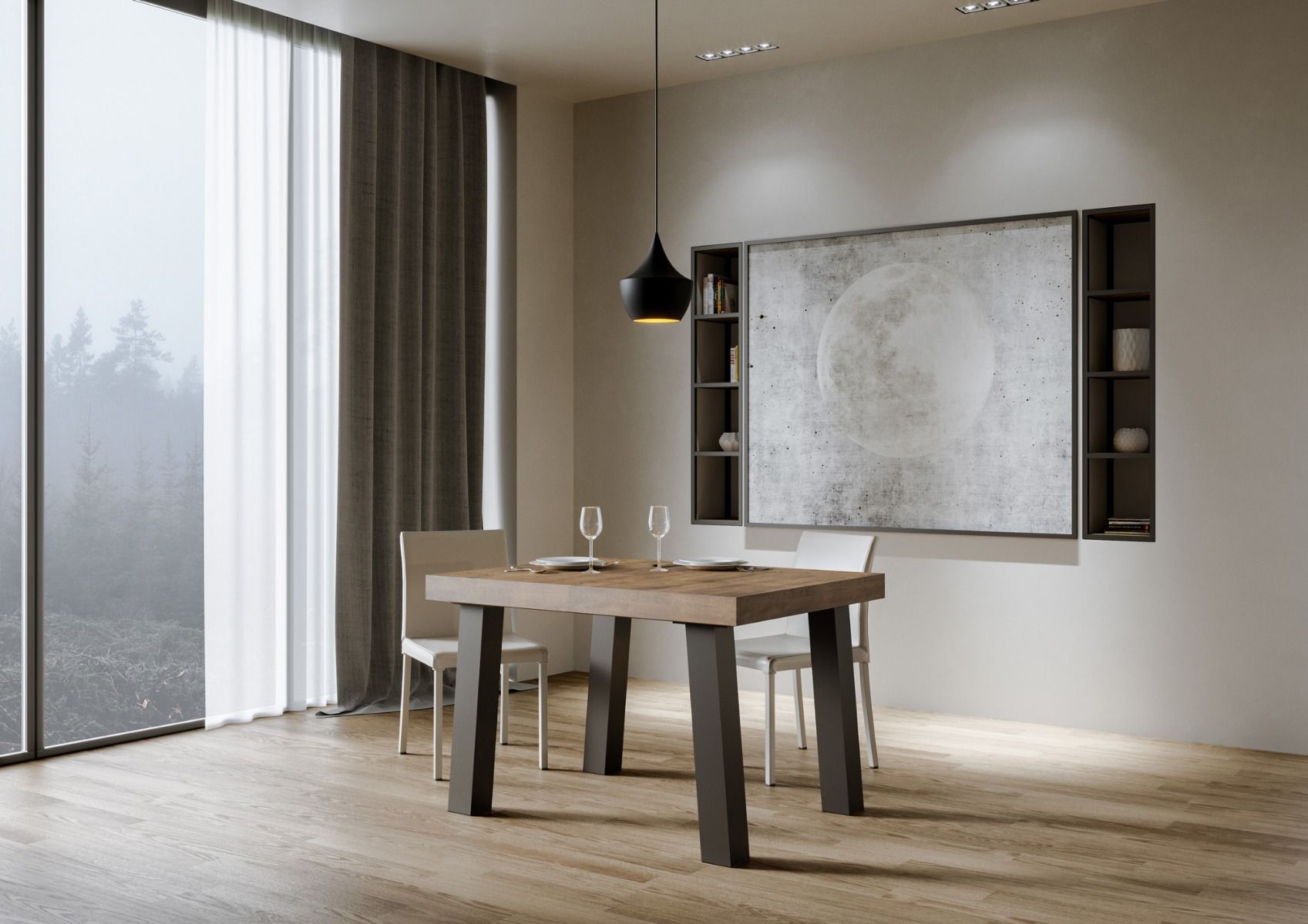 Tavolo da pranzo fisso Raman con piano in legno lavorato a folding e robuste gambe in metallo colore antracite. Le finiture disponibili per il piano variano dal classico bianco frassino al cemento o finiture naturali come noce.