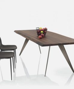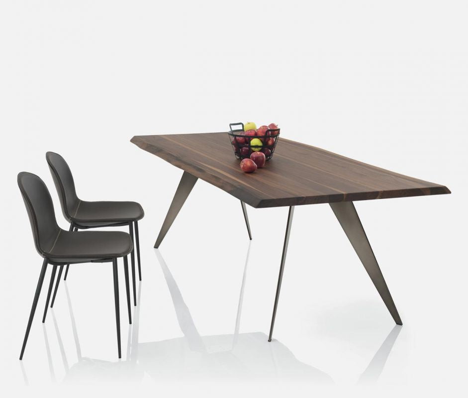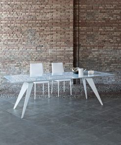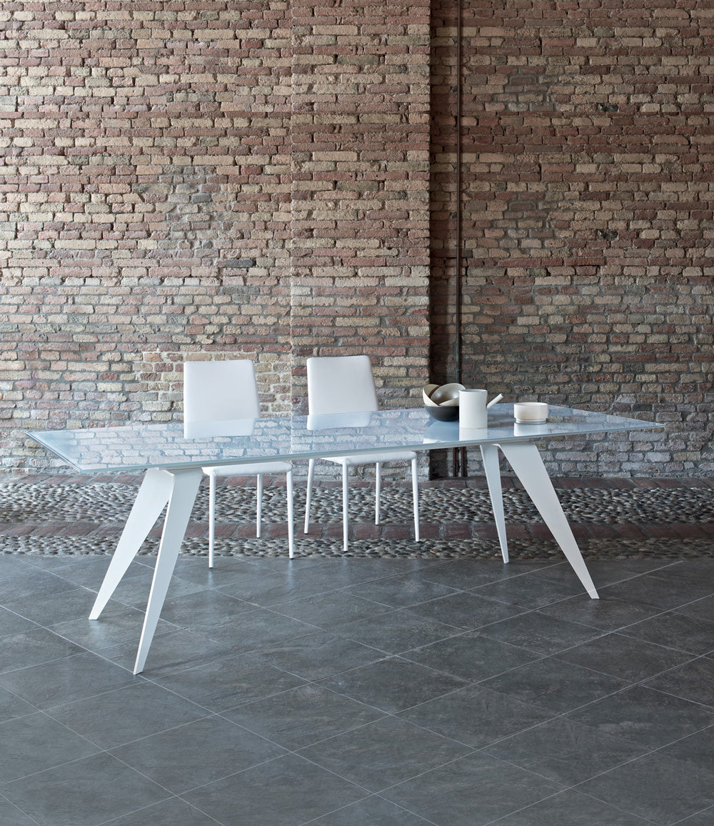 Il tavolo moderno Ramos si riconosce per le gambe oblique dalla forma triangolare e che terminano a punta, delineando una struttura orginale e d’avanguardia, interamente realizzata in acciaio.
