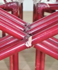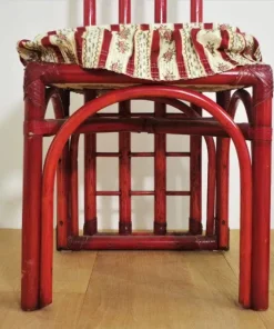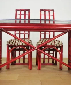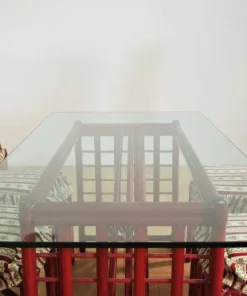 Set tavolo con piano in vetro e 6 sedie in bambù rosso, con cuscino per la seduta anni ’80.