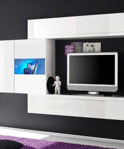 Parete moderna per soggiorno Rinald dal design contemporaneo, composta da elementi sospesi, come due pensili orizzontali, uno verticale e una vetrinetta, con possibilità di aggiungere una luce a led blu o RGB.