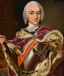 Il regnante, ritratto a mezzo busto, è invece immortalato con una sontuosissima armatura cerimoniale, sormontata da un mantello foderato di velluto viola ed ermellino, chiuso sul petto da una preziosa spilla in brillanti, che scende coprendo il braccio destro, con cui regge il bastone del comando. Alle sue spalle la corona, suo attributo regale.